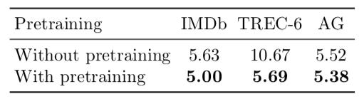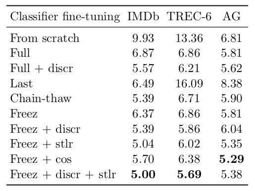 Target task LM fine-tuning: Full LM is fine-tuned on target task data using discriminative fine-tuning (‘Discr’) and STLR to learn task-specific features. Having task data LM tuning definitely helps in achieving better results especially when target data is less viz TREC-6.