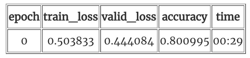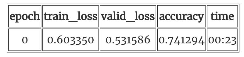 learn.freeze_to(-2) #Freeze till last 2 layerslearn.fit_one_cycle(1, slice(5e-3/2., 5e-3))This will give the following accuracy result: