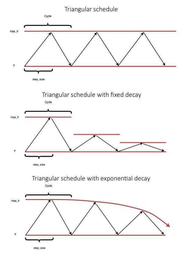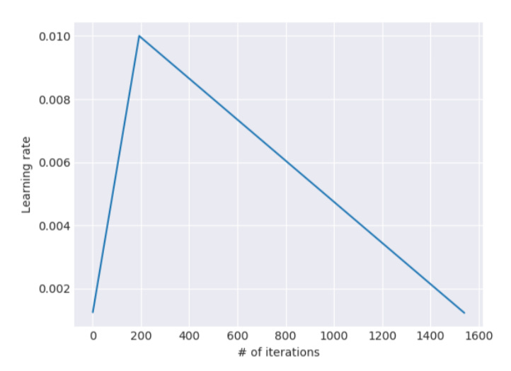 Smith, L. N. proposed cyclical learning rate (CLR) which gives us a way to find out the best LR for faster convergence without going too slow or noisy. To find the highest and lowest learning rates, run the training in mini-batches with increasing learning rate. Note the rate at which the loss starts increasing and that’s the maximum LR you can afford.