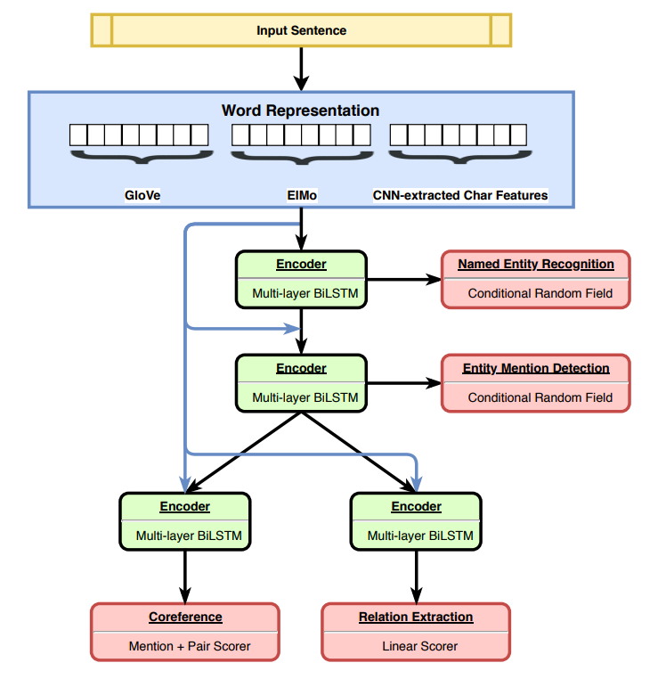 The tasks share common embeddings and encoders allowing an easy information flow from the lowest level to the top of the architecture.
