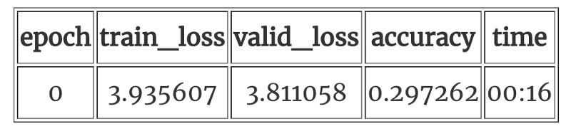 learn = language_model_learner(data_lm, AWD_LSTM, drop_mult=0.5) learn.fit_one_cycle(1, 1e-2)This will give the following accuracy result:
