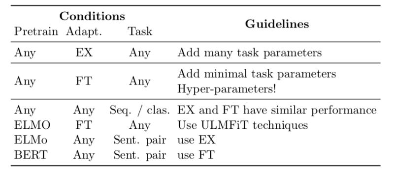 Peters et al., 2019, did an analysis of the effect of fine-tuning for both and came up with this advice. They compared two state-of-the-art pre-trained models, ELMo [Peters et al., 2018a] and BERT [Devlin et al., 2018] using both EX and FT across seven diverse tasks.