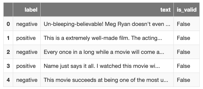 path = untar_data(URLs.IMDB_SAMPLE)df = pd.read_csv(path/'texts.csv') df.head()The data consists of the true label, text and is_valid column which states whether the row will be used for validation.