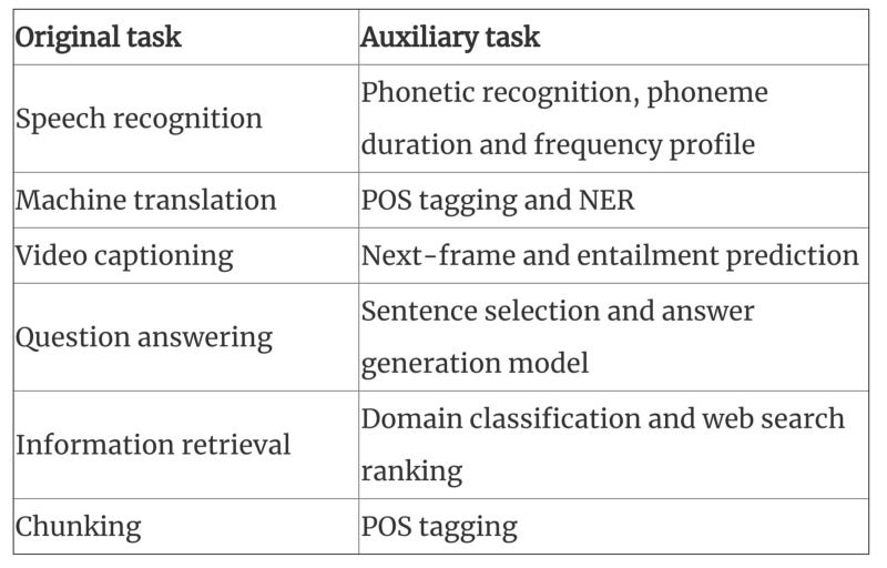 Xue et al. [2007] argued that two similar tasks will share similar classification boundaries. The common type of auxiliary tasks are: